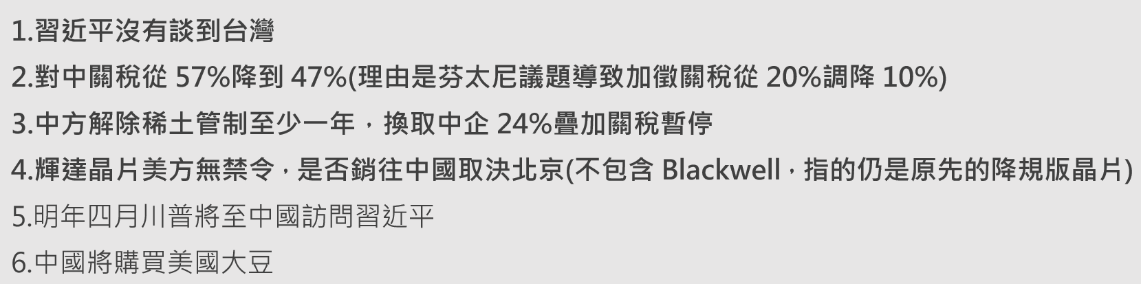 是一次平和的談判,有所進展,但成果比預期的更少,例如稅率調降幅度、一度謠傳的是全面解除晶片禁令,都算是雷聲大雨點小,從過度樂觀轉為合理,因此本質上風險性資產早盤上漲的過度反應回吐。加上晚間反映諸多重磅科技股財報公布,股市資金預計短期不會再特別聚焦於中美之間的關係。