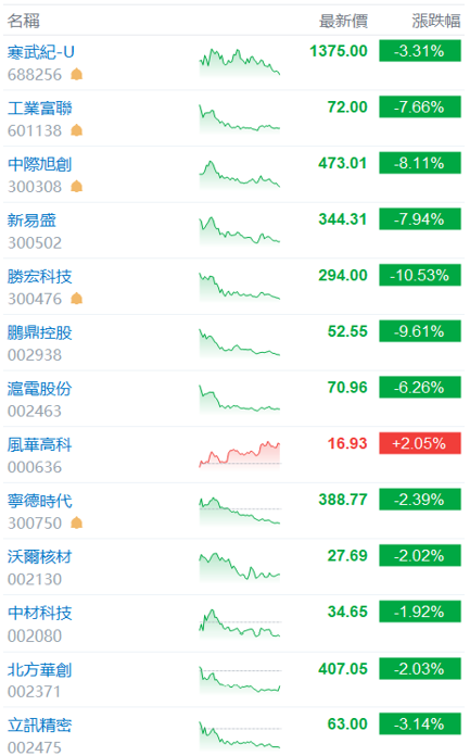 過往中國股市冷落股市,炒房為政府護盤指標,今年度明顯有轉移,跟進連動全球股市相對明顯,主要漲勢翻倍股,也都以AI伺服器相關供應鏈為主,縱使估值也貴,但至少資金流向是有別於過往國銀、房企、電動車、白酒等類股的。然而川習會後AI伺服器的明星科技股,連續兩天重挫,10/31當日表現如下