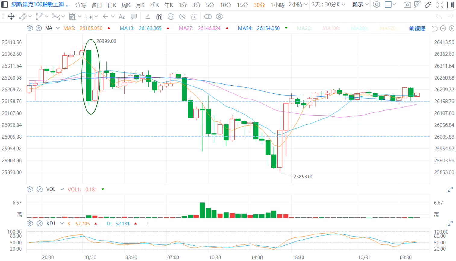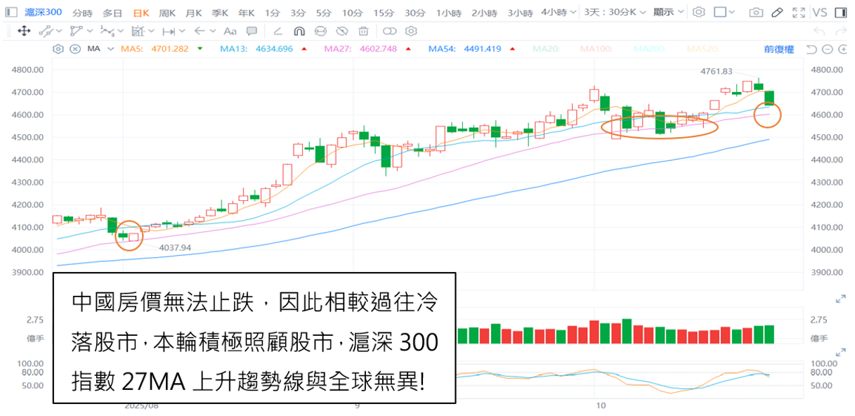 而27日均線的多方控盤與美股一致,再美國經歷財報的過程中,可以留意中國股市是否回測27日均線後是否有守,如果跌破,從亞股、美股可能也都有連動的修正壓力,可以此作為11月的先行觀察指標。