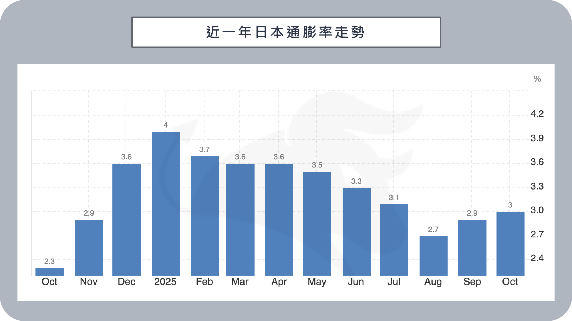 而通膨方面,11/21 官方統計公布 10 月日本剔除生鮮食品、含燃料成本的核心 CPI 年增率3%,高於日本央行的 2% 目標,也高於 9 月的 2.9%,創 7 月以來最高。若剔除能源與生鮮食品的「核心再核心 CPI 」則攀升至 3.1%,顯示物價壓力仍廣泛存在。日本整體通膨同樣維持在 3%,連續第 43 個月站上央行目標之上。