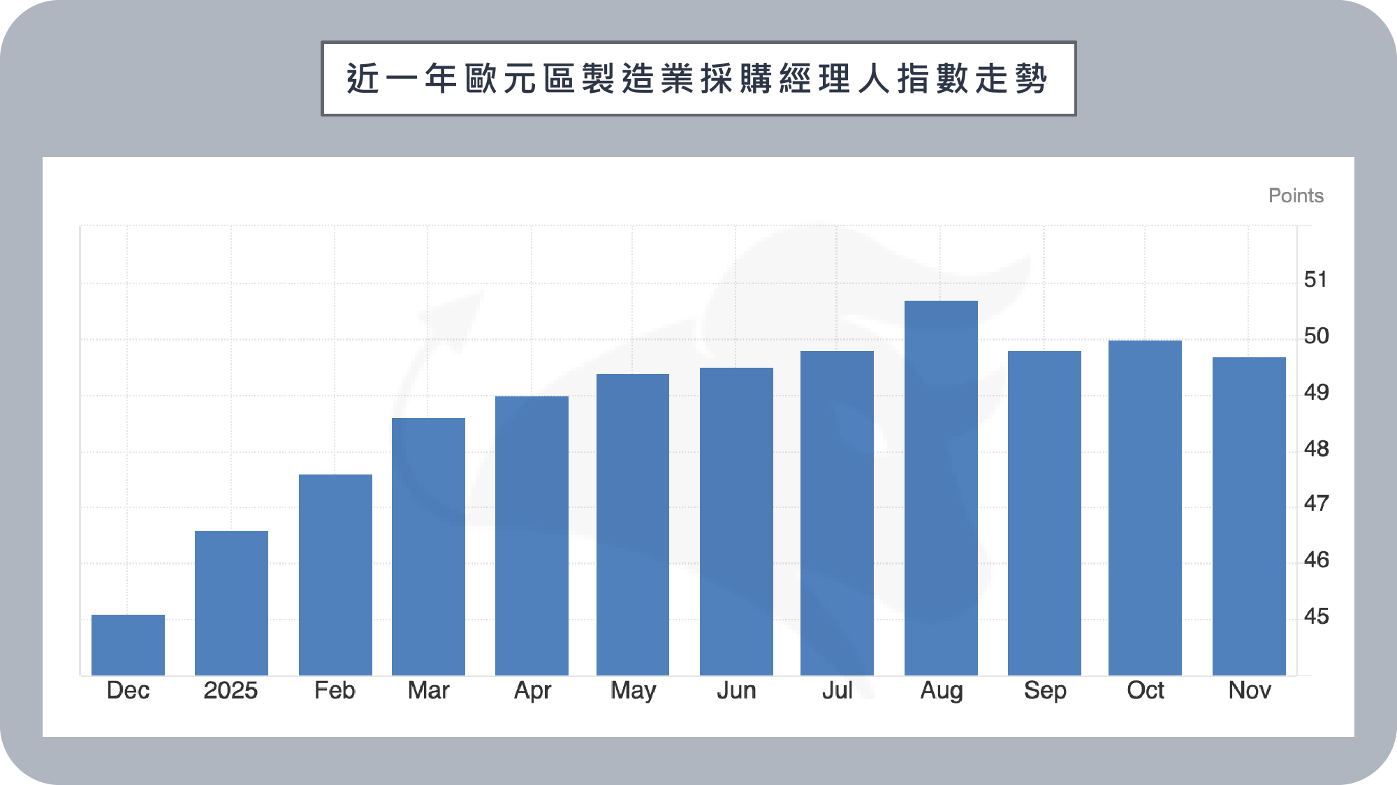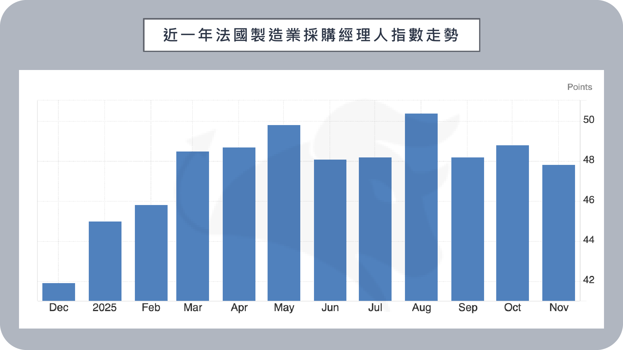 歐元區兩大經濟體的表現分歧加劇。德國 11 月製造業 PMI 從 49.6 降至48.4,服務業亦從 54.6 跌至 52.7,為兩個月低點,各項數據均遜於市場預期,突顯德國經濟仍處脆弱階段。法國製造業 PMI 則從 48.8 降至 47.8,創九個月新低;但服務業首次自去年以來站回 50.8,結束長期萎縮。分析指出,企業持續削減庫存,庫存周期尚未出現反轉跡象,意味實體經濟復甦仍不穩固。