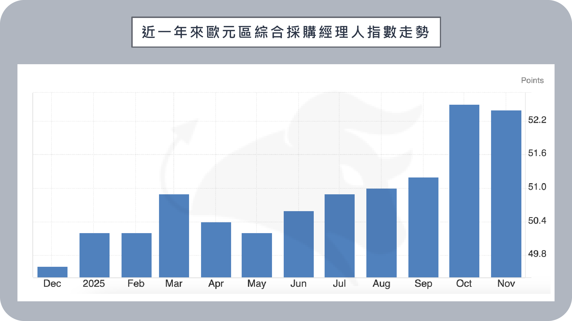 製造業方面,歐元區在 10 月短暫重返擴張後,11 月再度跌回萎縮區間,製造業 PMI 從 10 月的 50 降至 49.7,創五個月新低,遜於市場預期。新訂單與就業同步下滑,企業庫存加速去化,並寫下七個月來最快裁員速度;投入成本三個月來首次上升,為八個月最大增幅。不過,企業對未來的信心升至五個月高點。服務業仍是支撐區域經濟的主力,11 月服務業 PMI 微升至 53.1,創一年半新高,抵銷了製造業乏力的影響,帶動整體商業活動維持擴張。