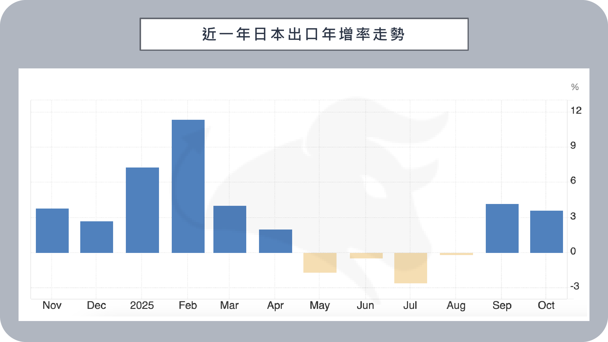 日本最新公布的出口、物價與經濟政策數據顯示,受惠於日圓走弱與外需改善,10 月出口表現超出預期,同時通膨維持高檔,使市場對日本央行短期內升息的預期再度升溫。11/21 官方統計顯示,10 月日本出口年增 3.6%,增幅高於市場預估的 1.1%,雖低於 9 月的 4.2%,但呈現連續兩個月成長。儘管美國對日本產品課徵高關稅,使外界對出口前景感到疑慮,但從最新數據來看,美國關稅的實際衝擊較先前擔憂的程度更有限。出口回升與通膨維持高檔的情況同時出現,反映日本景氣正從今年前半的疲弱走出,這也提高了日本央行在12月或明年1月進一步升息的可能性。
