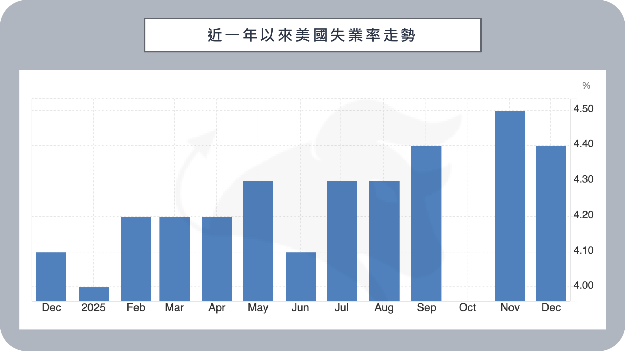 1/9 美國勞工部公布,2025 年 12 月非農就業人口僅新增 5 萬人,不僅低於11 月下修後的 5.6 萬人,也遠不及市場預期的 7 萬至 7.3 萬人,顯示就業成長持續降溫。不過,12 月失業率小幅下降至 4.4%,優於市場預估的 4.5%,平均時薪年增率達 3.8%,高於預期,反映勞動市場仍具一定韌性。