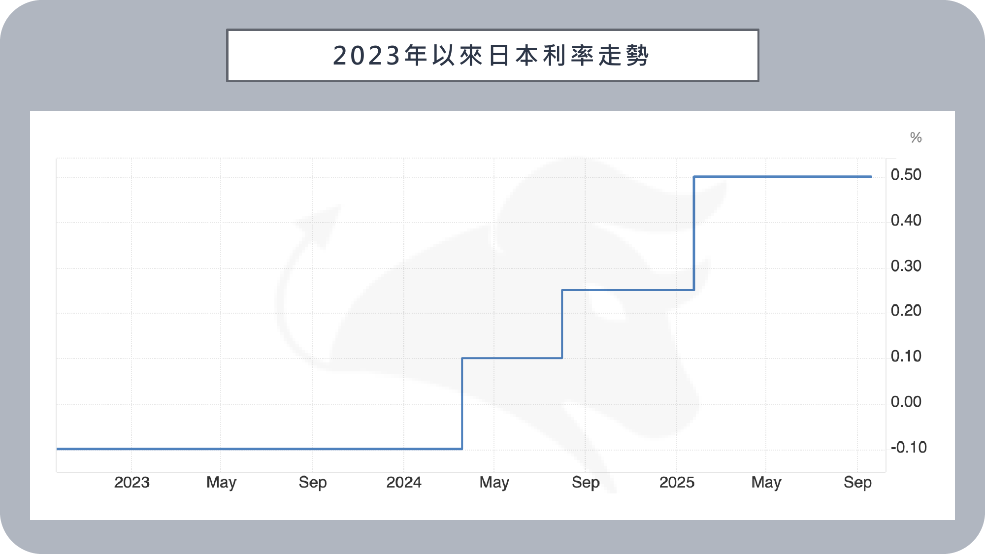 9/18 ~ 9/19 日本央行啟動的兩天利率決策會議,最終以 7 比 2 的票數決議維持基準利率 0.5% 不變,兩名委員則罕見投下升息 1 碼至 0.75% 的鷹派票。會中同時宣布逐步出售風險資產,包括每年約 3,300 億日圓的 ETF 與 50 億日圓的 J-REITs,釋出自超寬鬆政策退場的明確訊號,並表示將以超長期節奏推動,盡量降低對市場的擾動。市場預估 10 月有機會小幅升息 25 個基點至 0.75%。