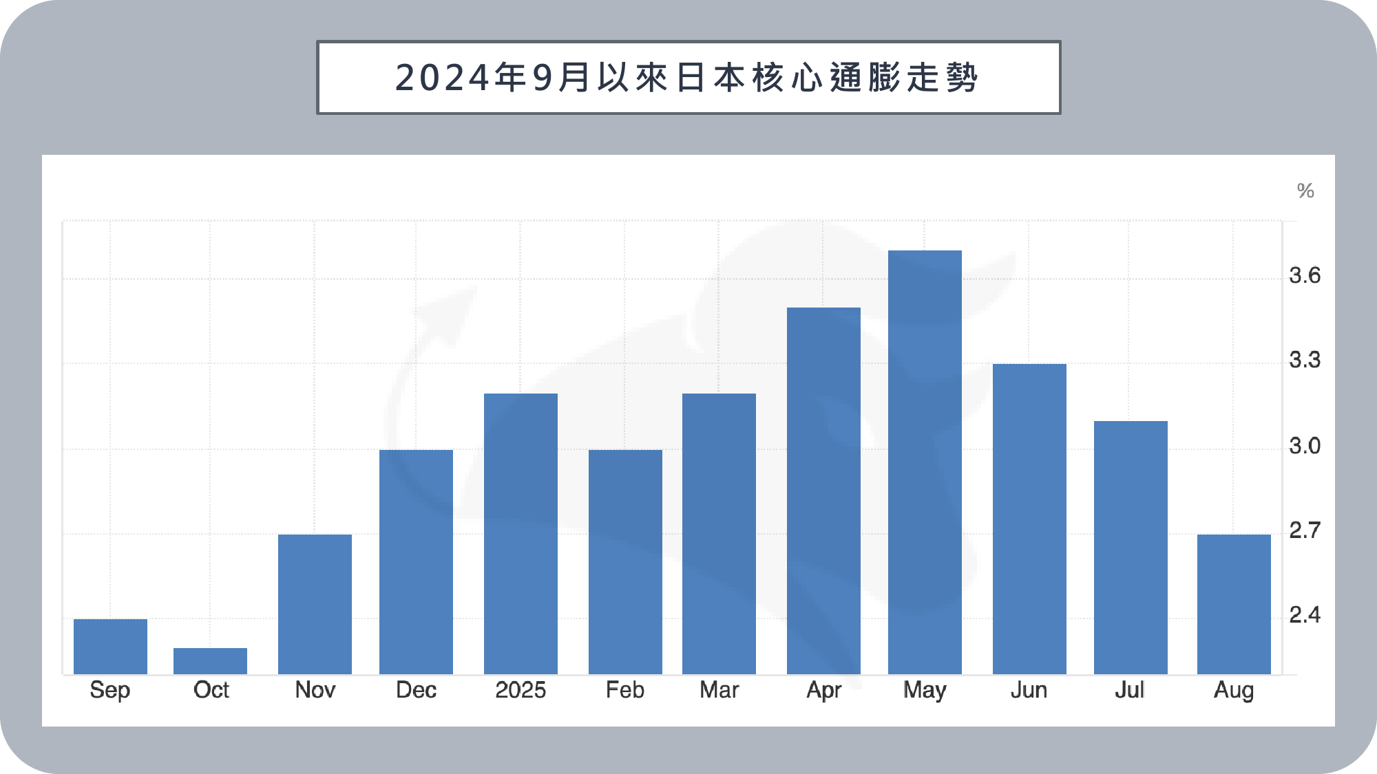 日本政府公布的 8 月核心 CPI 年增 2.7%,雖仍高於 2% 的政策目標,但為 9 個月來最低,顯示物價壓力有所緩解;若進一步剔除生鮮與燃料,核心核心 CPI 年增 3.3%,較 7 月的 3.4% 略微下降。總裁植田和男會後指出,食品通膨將逐步消退,不會對整體通膨造成重大影響,只要經濟與物價前景持續改善,日銀將考慮延續升息路徑。