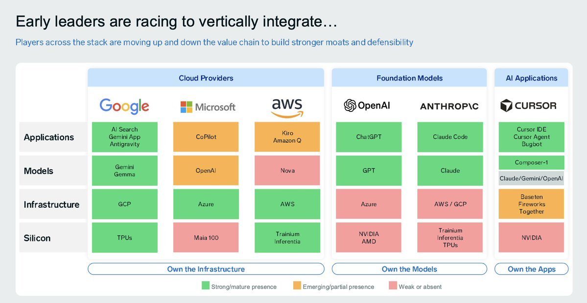 AI競爭進入白熱化,大型CSP買家部分是自有開發,部分是與新創LLM廠商外部合作,按照以下圖表,比較應用程式、LLM模型、使用算力的基礎建設平台、AI加速器之所屬陣營,整理如下。