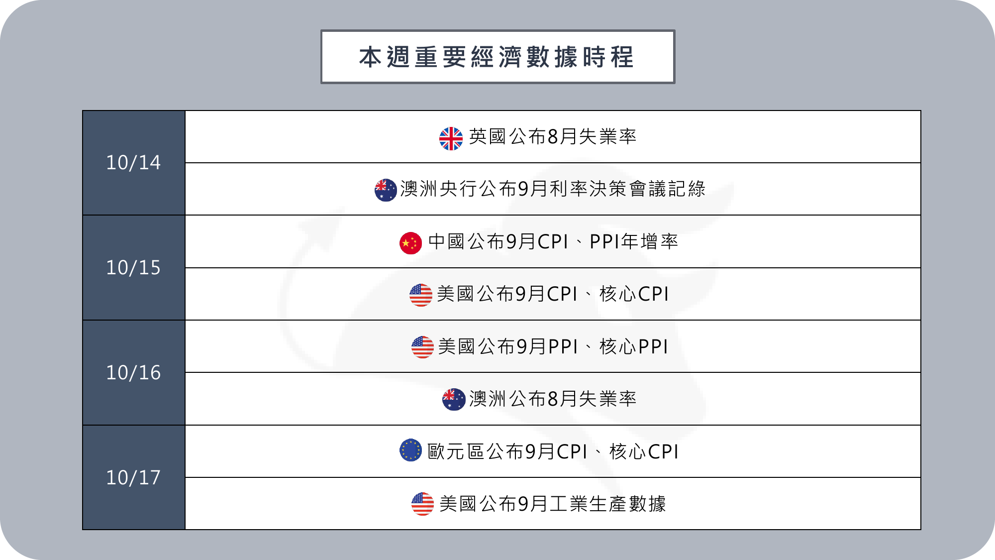 隨著政府資金中斷,美國多項經濟數據發布延遲。勞工統計局 BLS 原先全面停擺,包括非農就業與通膨報告都暫停。不過白宮官員表示,BLS 已召回部分員工,預計 10/24 發布 9 月非農就業報告,比原定日期延後 9 天,仍能趕在聯準會 Fed 於 10/28 ~ 10/29 舉行的利率決策會議前公布。BLS 同時預備發布 9 月消費者物價 CPI 指數,以供社會保障署計算明年退休金生活成本調整,影響數百萬名仰賴福利金的民眾。