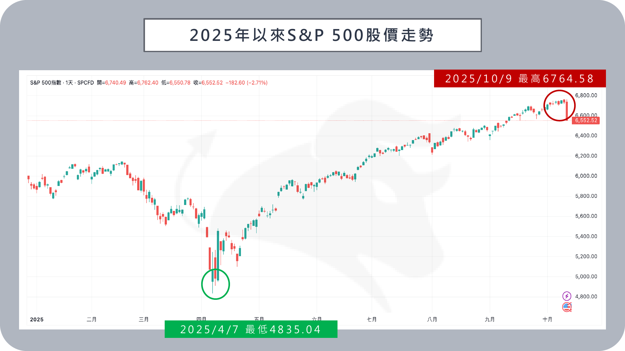 然而,川普的強硬言論仍立即震撼全球市場。10/10 他在 Truth Social 發表約500 字貼文,指中國在稀土掌控上「挾持世界」,並暗示將大幅提高中國商品關稅。短短幾分鐘內,美股全面急挫,蒸發市值高達 2 兆美元。S&P 500 指數重挫 2.7%,創下 4 月以來最差表現; NASDAQ 暴跌 3.56%,Dow J 指數大跌 879 點。市場分析指出,投資人原先認為美中談判進展緩慢但仍有共識,如今情勢急轉直下,信心迅速瓦解,特別是科技與半導體相關個股受創最深。
