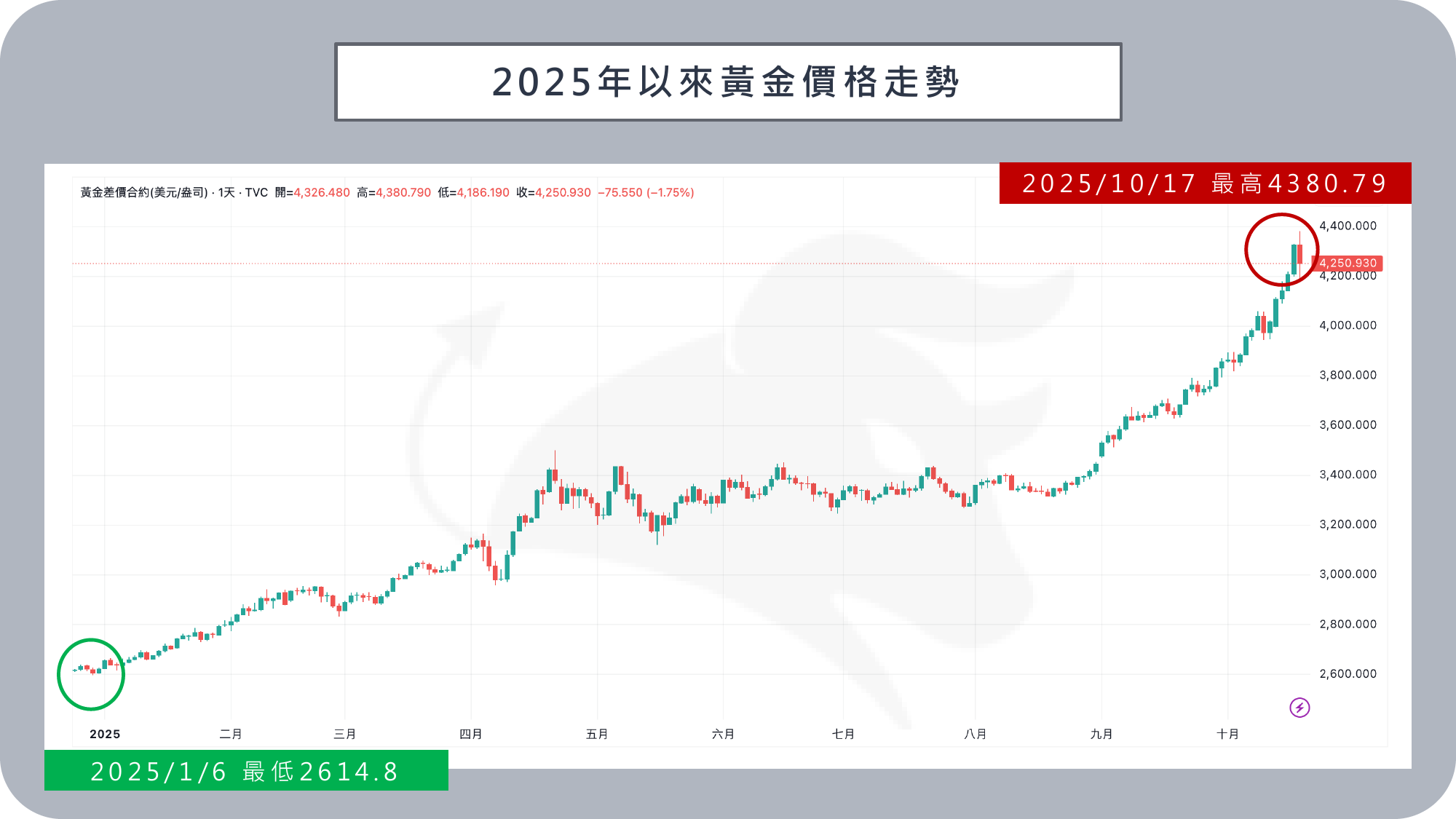 國際金價續創歷史新高,10/15 金價突破每盎司 4,200 美元關卡,今年以來金價漲幅已近六成,10/17 更進一步衝上 4,378.69 美元,再度刷新紀錄。黃金連四個交易日收漲,本週累計漲幅達 8.6%,為近 17 年來最強單週表現。外界普遍認為,在地緣政治緊張、美中貿易摩擦升溫與聯準會降息預期加持下,避險情緒推動金價短期內可能挑戰 4,500 美元,甚至更高水準。