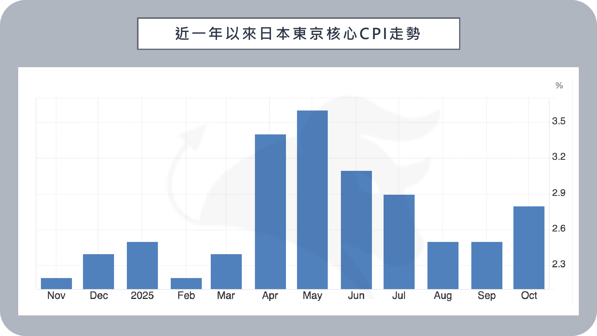 國內貨幣政策方面,10/30 日銀以 7 比 2 維持利率 0.5% 不動,但總裁植田和男罕見松口 12 月可能升息,前提是需看更多企業調薪證據。全球貿易政策不確定、尤其美國新關稅的影響仍是日銀顧慮點。東京 10 月核心 CPI 年增 2.8%,高於市場預估的 2.6% 也比 9 月的 2.5% 要大,食品與服務價格維持在高檔,上漲的原因之一是日本白米價格大漲 38.4%,還有水費補助暫時先告一段落。調研單位 Sompo Institute Plus 認為,在食品價格上漲的程度愈來愈小之下,核心消費者通膨預計將可趨緩,本來預估日本央行應該會在 2026 年 1 月升息,但目前看來高市支持寬鬆的政治態度,也使政策路徑變得更複雜。歐洲央行同日也維持利率不動,反映其視通膨已接近目標、暫無降息壓力。