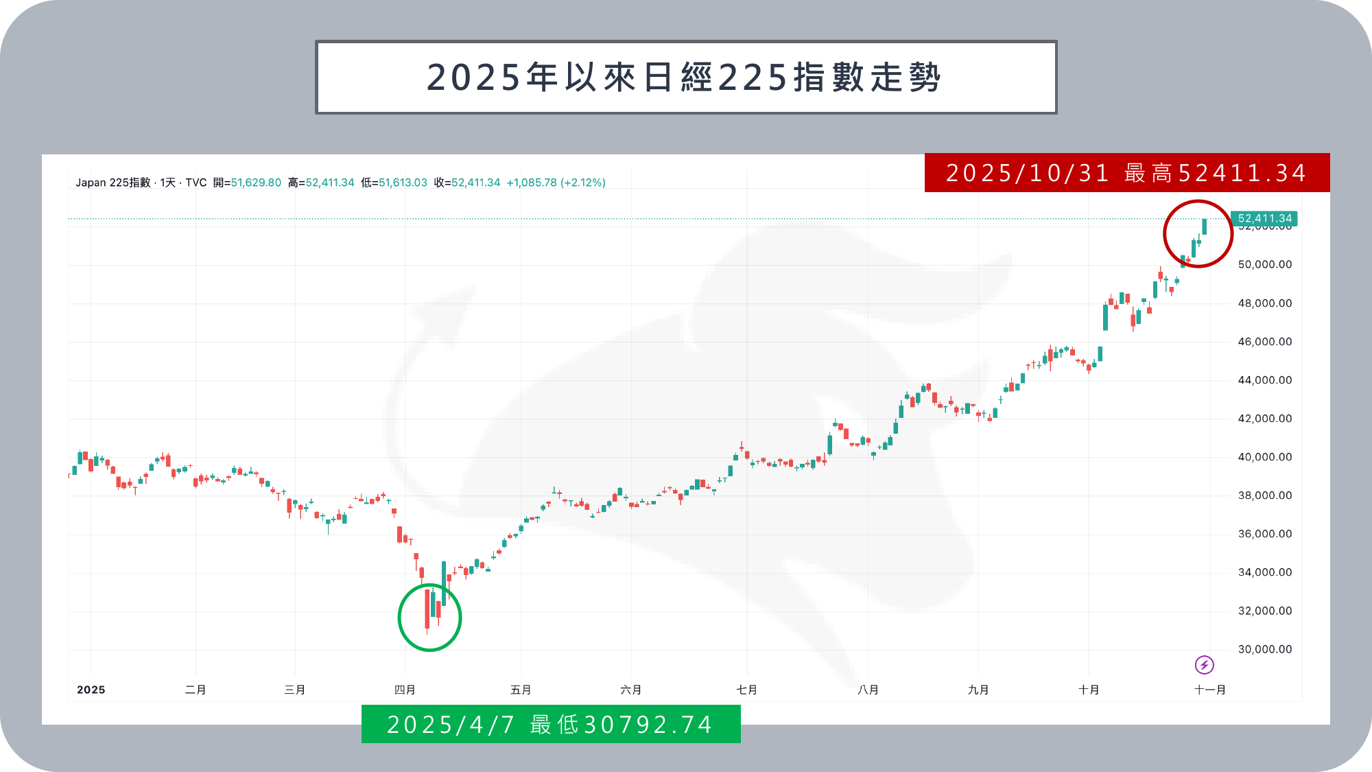 在這一連串政治與政策訊息下,日本股市日經 225 盤中再創新高,收 52,411 點,大漲逾 2%,單月狂漲 16.6%,為 30 多年來最大月漲幅。弱日圓推升出口族群,電子股全線大漲。