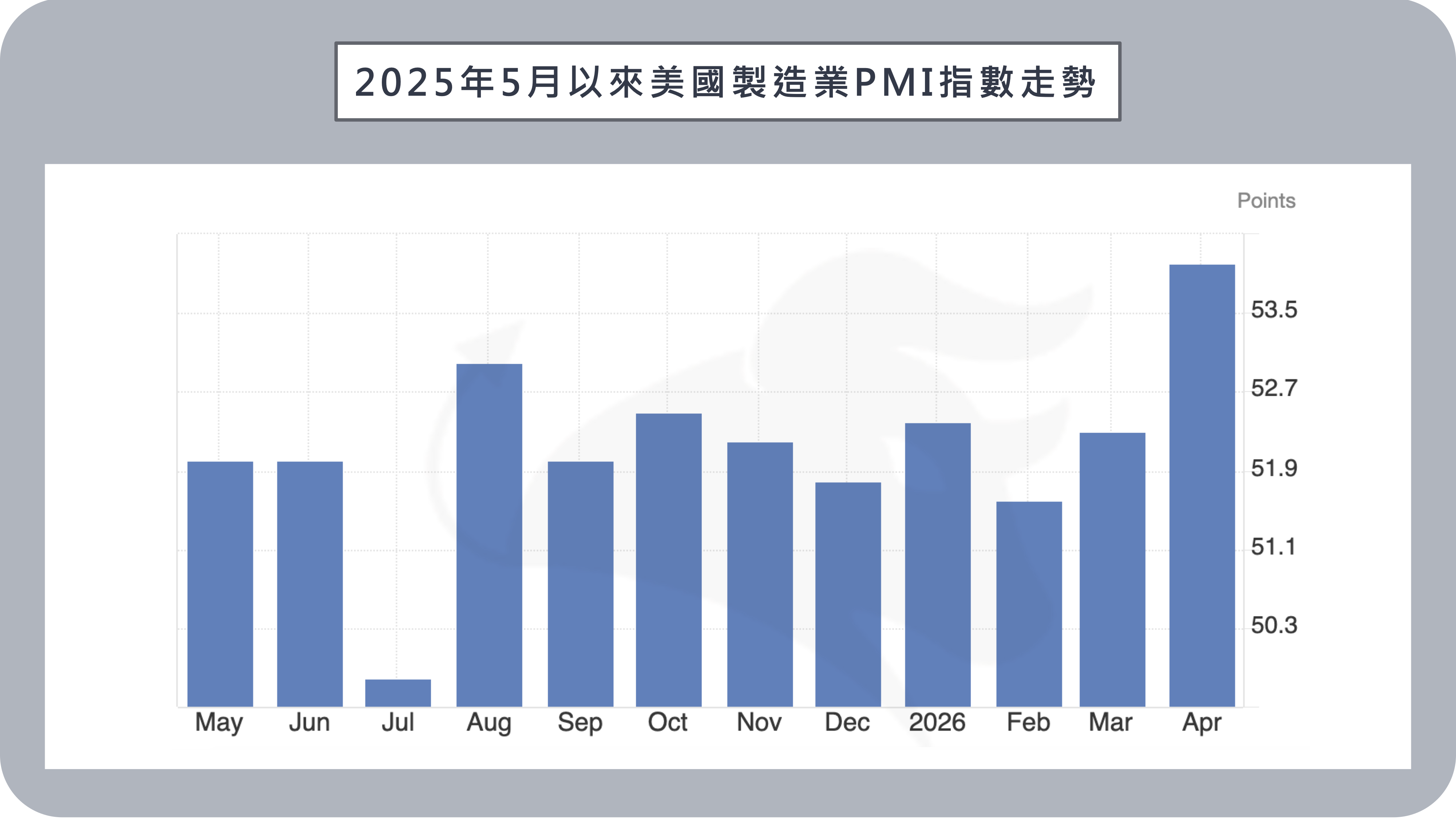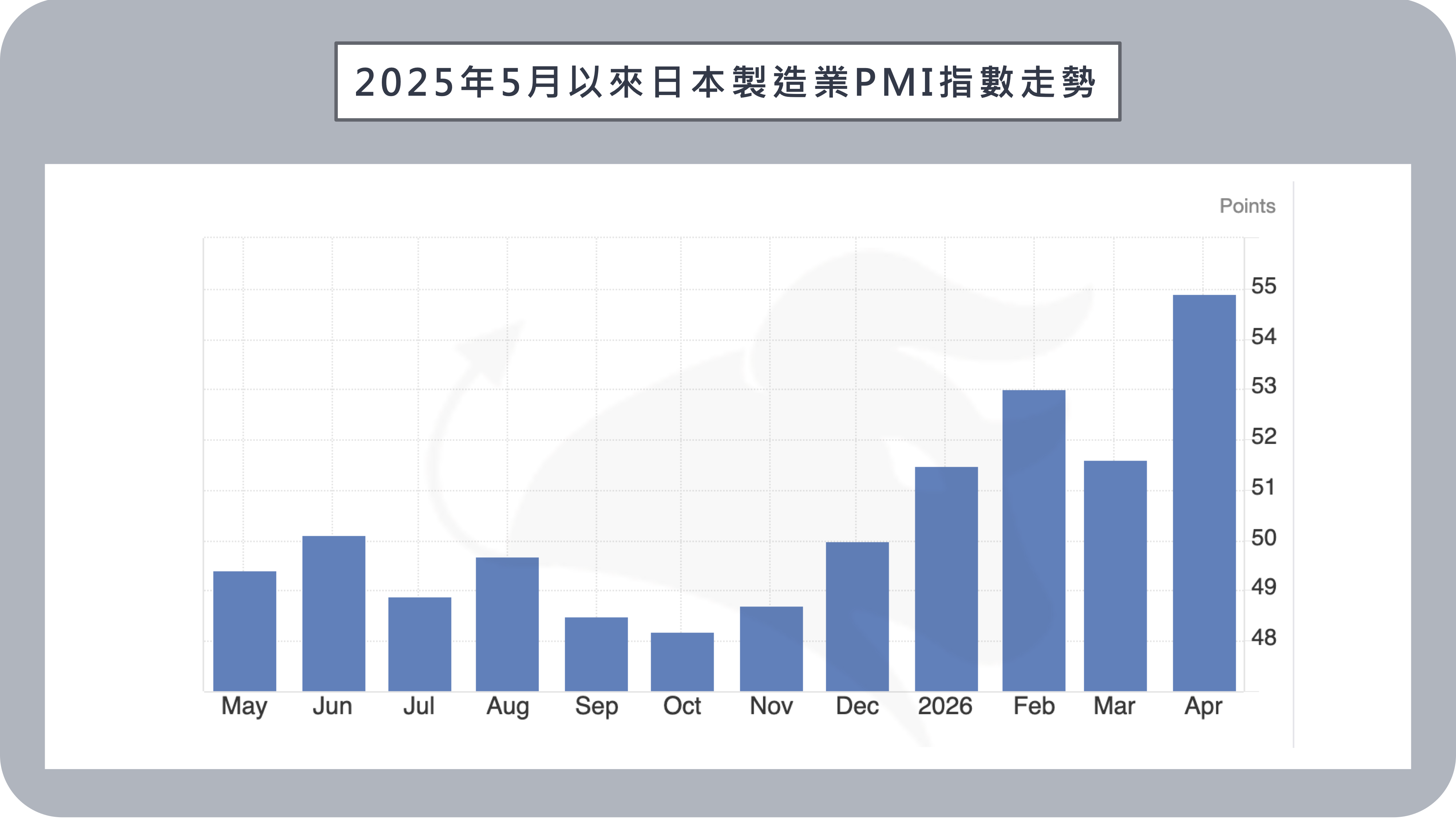 日本公布 4 月製造業 PMI 指數初值由 3 月的 51.6 大幅升至 54.9,不僅遠高於景氣榮枯線 50,也創下自 2022 年 1 月以來新高。其中製造業 PMI 指數從 52.1 升至 55.4,為 2014 年 2 月以來最大升幅,顯示企業為因應潛在供應短缺而提前備貨與增產,使得製造業動能顯著轉強。服務業 PMI 初值由 3 月的 53.4 降至 51.2,創下 11 個月新低,顯示需求面開始轉弱。綜合 PMI 由 53 下滑至 52.4,為 4 個月來最慢擴張速度,反映出「製造業補庫存」與「服務業需求降溫」的結構性落差。日本企業在 4 月面臨顯著成本上升。投入成本創下 2023 年 1 月以來最大漲幅,而產出價格則創 2007 年底有統計以來最大升幅,顯示企業正逐步將能源與原物料上漲轉嫁至終端價格。同時,商業信心連續兩個月下滑,4 月更跌至 2020 年 8 月疫情以來低點,反映企業對未來供應鏈與需求的不確定性持續升高。