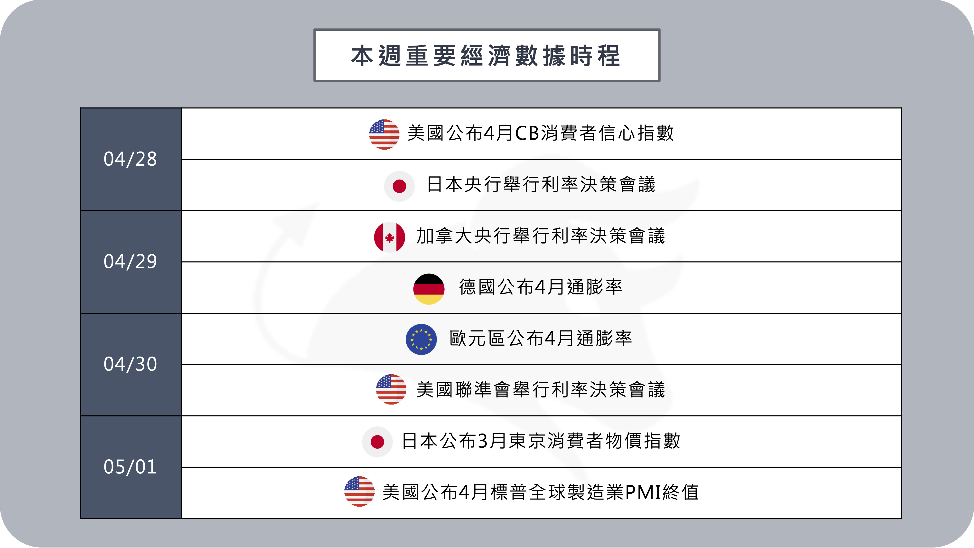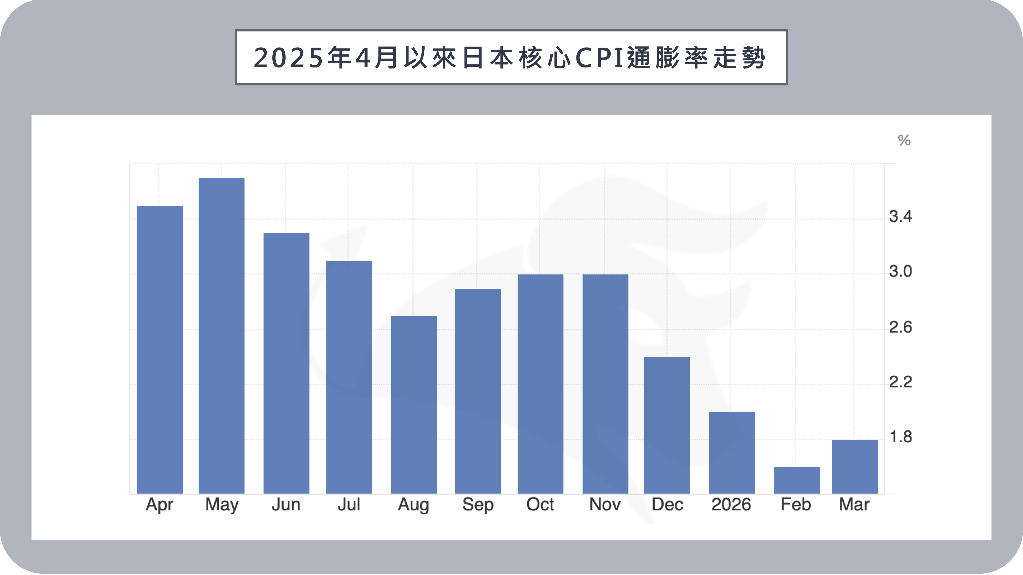 4/24 日本政府公布 3 月核心 CPI 年增 1.8%,雖較 2 月的 1.6% 回升,但仍低於日本央行 2% 的政策目標,已連續第二個月未達標。若進一步排除能源因素的核心再核心 CPI 則由 2.5% 降至 2.4%,顯示需求端通膨動能略有放緩。不過市場普遍預期,隨著中東衝突推升能源價格,企業逐步轉嫁成本,通膨將在未來數月重新回升,甚至可能高於央行目標。日本央行預計於 4/27~4/28 召開利率決策會議,市場預期將暫緩升息,但釋出偏鷹派訊號。
