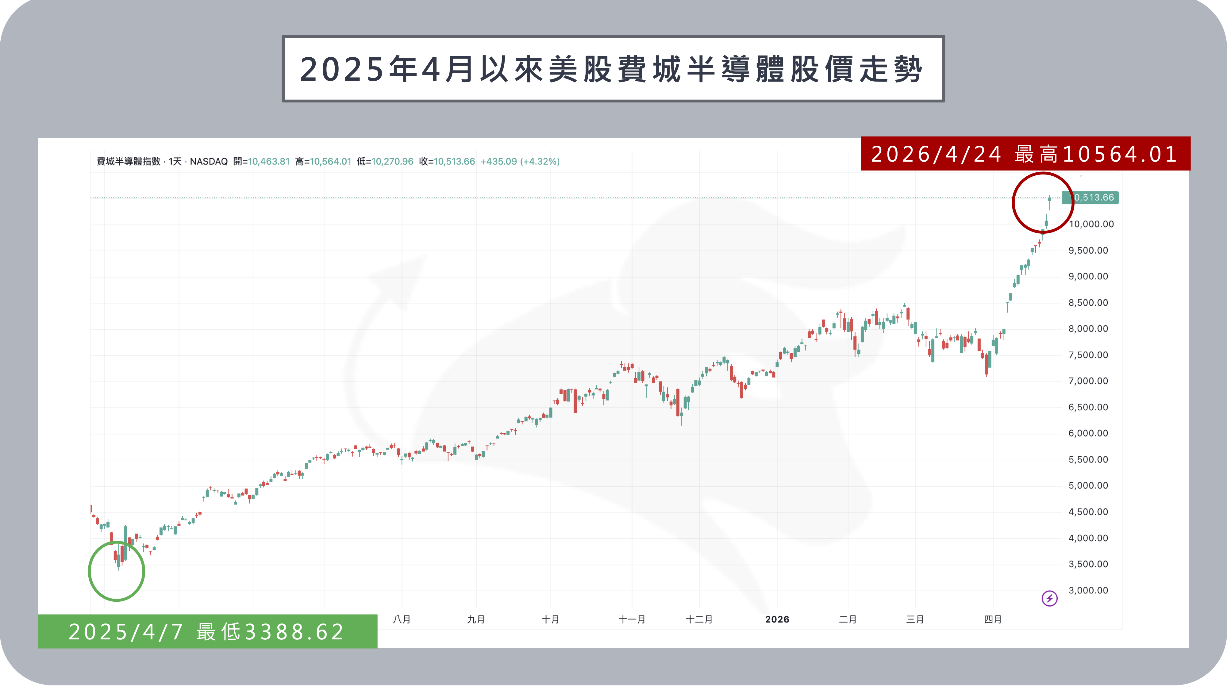 市場憧憬美國與伊朗展開和平談判,加上科技股帶動,4/24 美股普遍走高,S&P 500 和 NASDAQ 指數、費城半導體指數齊步創下新高,其中費城半導體指數,連漲 18 個交易日,為歷來最長連漲紀錄。Dow J 工業指數終場下跌 79.61 點,收在 49,230.71 點;S&P 500 指數上漲 56.68 點,收在 7,165.08 點;NASDAQ 指數上漲 398.10 點,收在 24,836.60 點;費城半導體指數上漲 435.092 點,收在 10,513.664 點。