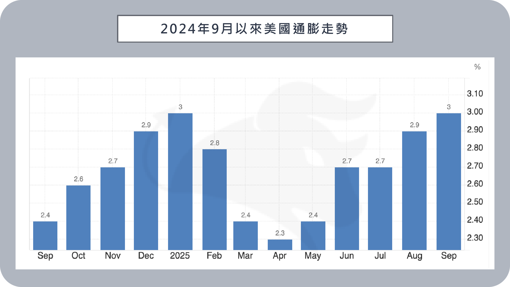 10/24 美國勞工統計局公布,9 月消費者物價 CPI 指數年增 3.0%,低於市場原先預估的 3.1%,月增率為 0.3%,同樣低於經濟學家預期的 0.4%。扣除食物與能源價格後的核心 CPI 月增 0.2%,年增 3.0%,也都低於市場預估的 0.3% 及 3.1%。根據美國勞工部,這份報告是在聯邦政府關門、其他多數經濟數據停擺的情況下延後公布,因此格外受到市場與決策層關注。