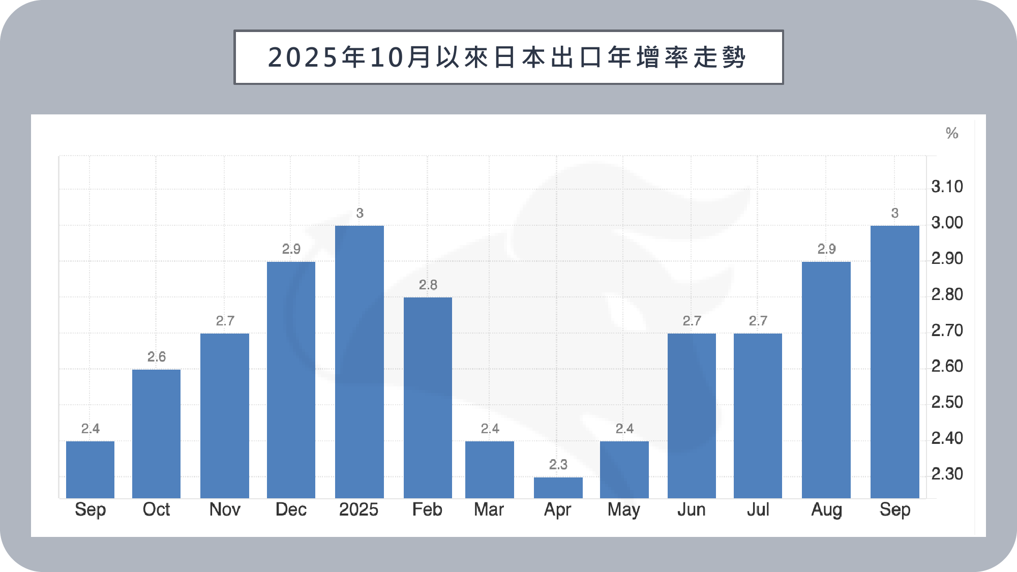 同時,日本 9 月出口額年增 4.2%,終結連續四個月下滑,其中對中國出口成長 5.8%、對亞洲整體出口大增 9.2%,半導體出口年增 12.6% 為主要動能。雖對美出口下滑 13.3%,但新日美貿易協議使關稅自 8 月降至 15%,緩解部分衝擊。