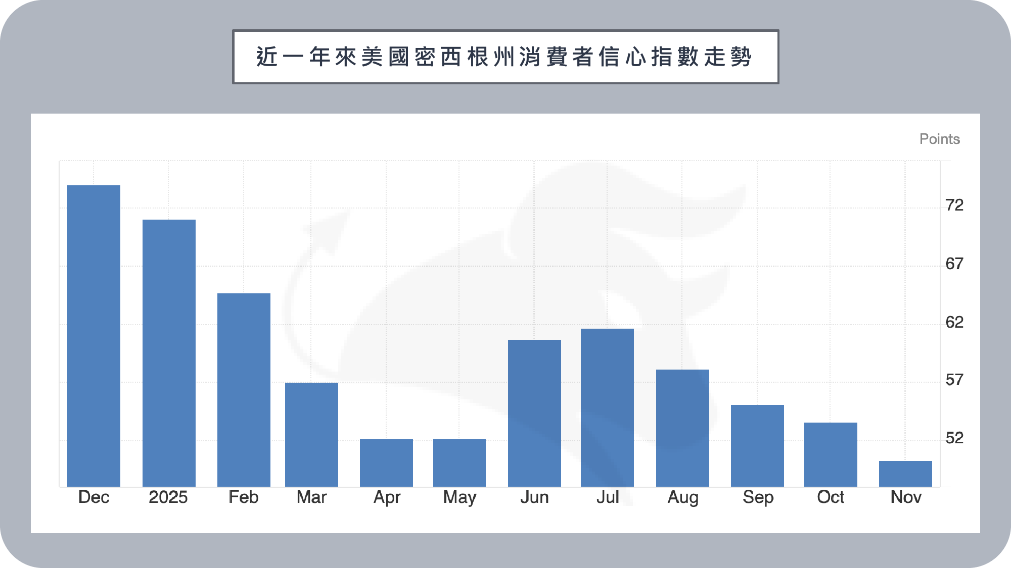 經濟層面上,衝擊也正在被量化。美國國會預算辦公室 CBO 估算,依停擺時間長短,第 4 季實質 GDP 年增率恐下滑 1 至 2 個百分點。外媒分析,每停擺一周將拖累 GDP 約 150 億美元。11/7 密西根大學 11 月消費者信心指數初值從 53.6 跌至 50.3,為 2022 年 6 月來最低,反映物價與就業的不安感加劇。