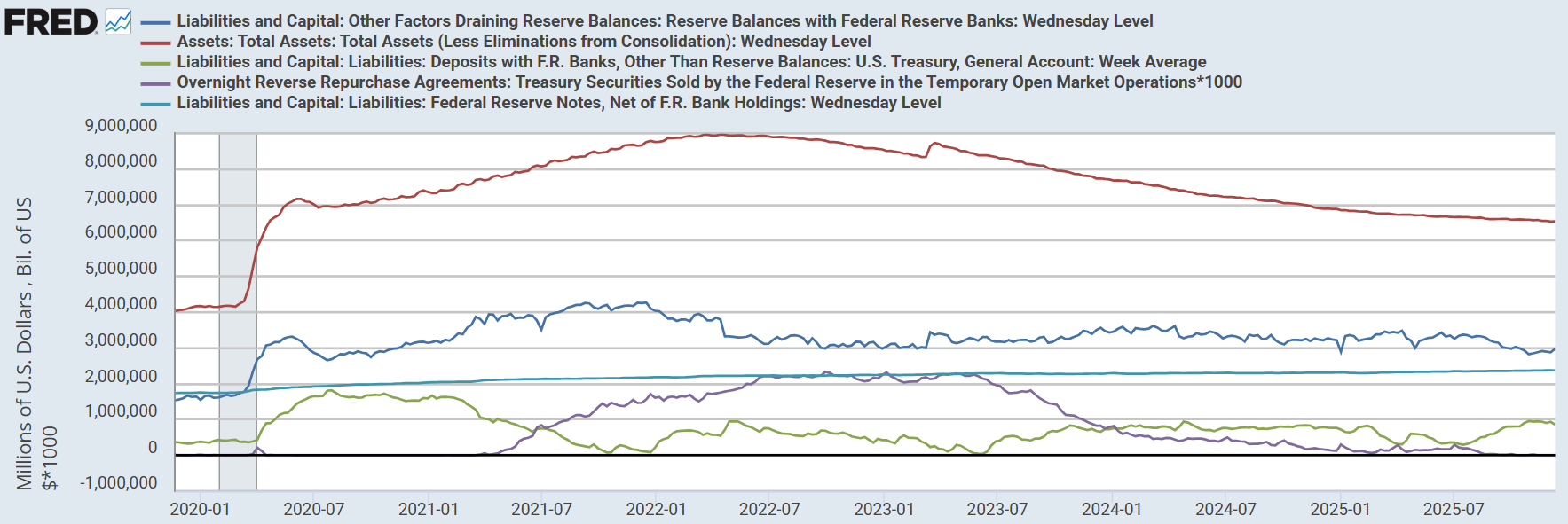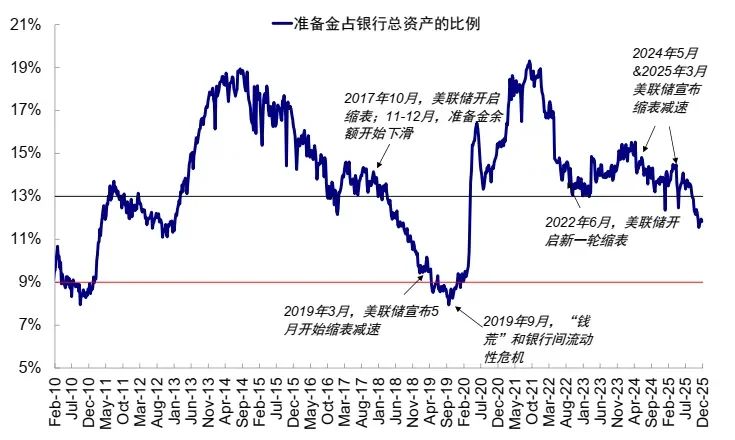 →從上圖中的FED資產負債表,可看出深藍色的銀行準備金,先受縮表影響(紅線),再者從隔夜附買回餘額(紫線)降至0,且遭遇政府關門TGA(綠線)飆高而下滑,縱使政府重啟,TGA釋放流動性,但目前處於3兆的水位,是否緊缺不確定,但至少不是寬裕的,且1/31很可能再度關門,認為FED是有預判/預防性質的舉動。