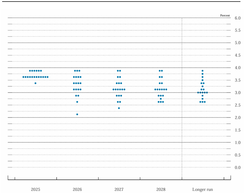 採多數決本次降息1碼3週以前已被定價,並沒有意外,本次3票反對9票贊成,而上週提及更應該關注的是點陣圖,如下圖所示,2025那欄的19個點中顯示6點反對,13票贊成(米蘭贊成降2碼),這是37年來最大分歧。