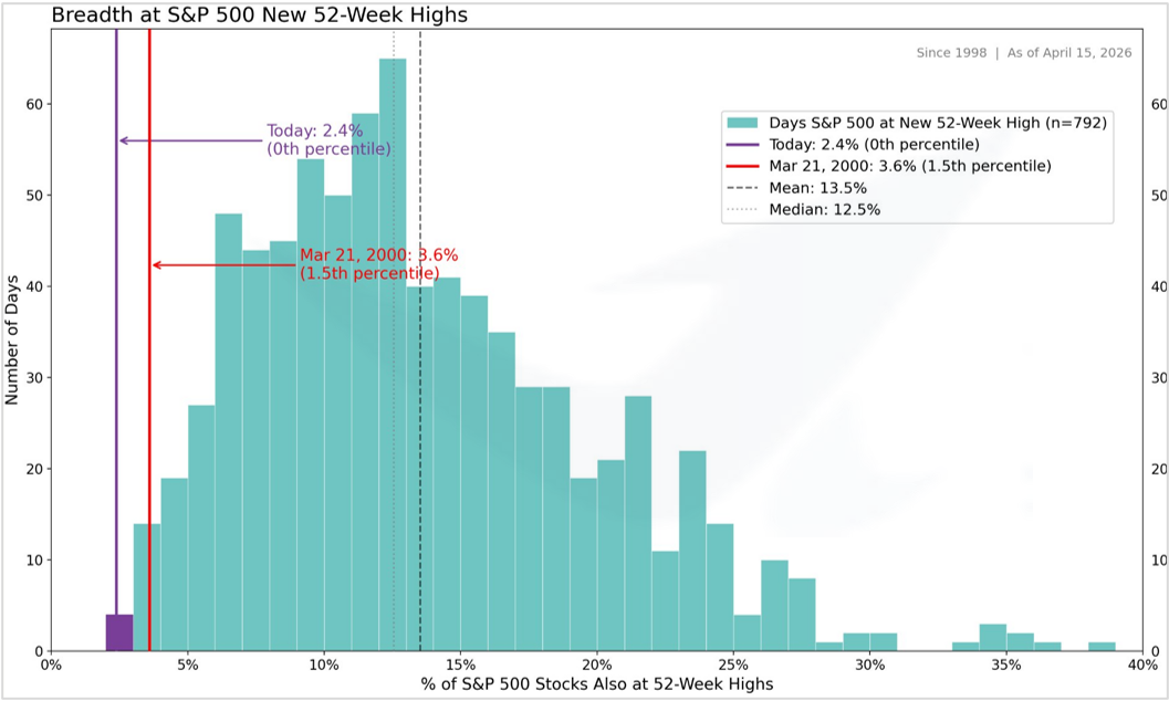 美股在CSP廠商強力跌深反彈,加上已經創高的費半,帶動S&P500、Nasdaq終於回到歷史新高,Nasdaq連續12個交易日收漲,創下自2009年以來最長連漲紀錄!而與此同時,關於市場廣度的難堪紀錄也誕生,在大盤處於歷史新高的交易日中,S&P500處於52週(一年)新高的家數,僅有2.4%也就是12家,是1998年來的最低數值。