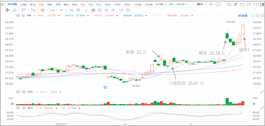 川普政府8月開始關注英特爾(視為美國製造的相關議題),美國政府從晶片補貼轉為取得10%股權後,軟銀先對英特爾投資20億美元,輝達投入50億美元,以上半年就虧損37億美元的INTEL,持續尋求資金援助,也就有了接洽蘋果商談投資事宜的最新訊息。