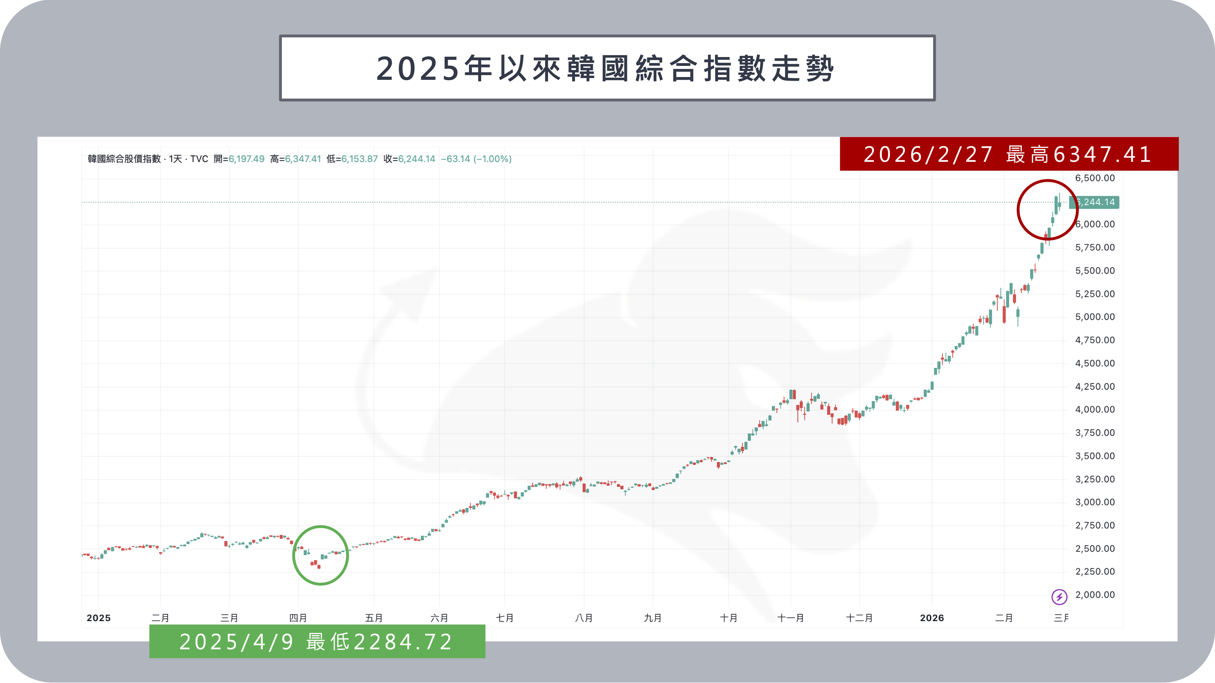 在出口外需強勁與經濟成長上修的背景下,韓國股市同步展現史無前例的強勢。2/25 韓國綜合股價指數 KOSPI 盤中創下 6,144 點歷史新高,收盤於 6,083 點,連續多個交易日收紅,今年以來漲幅已突破四成。韓股總市值攀升至 3.76 兆美元,全球排名升至第 9 位。本波行情的核心動能同樣來自 AI 浪潮推升半導體與記憶體需求。三星電子與 SK 海力士在全球 DRAM 市場占有率接近七成,幾乎壟斷 AI 算力核心 HBM 供應鏈,記憶體價格因供給吃緊而持續上揚,使韓國晶片族群成為市場主軸。